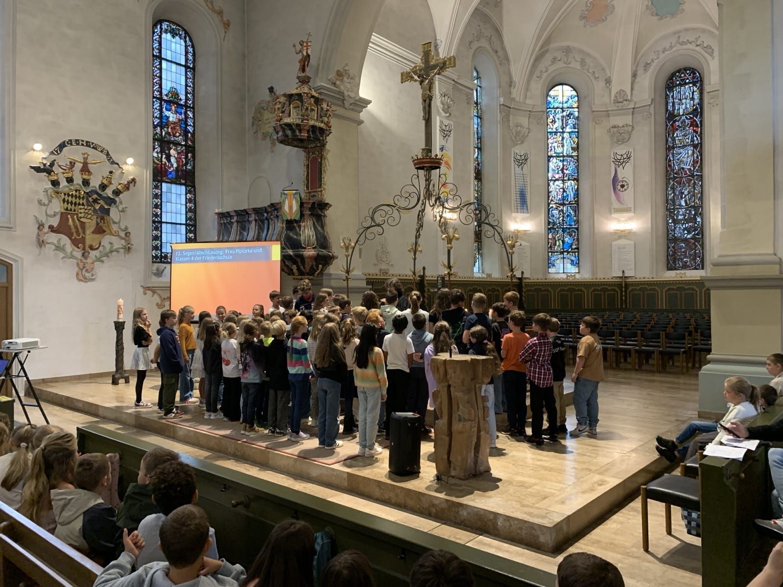 Am letzten Schultag vor den Sommerferien feierte unsere Schulgemeinschaft einen festlichen Gottesdienst in der Martin-Luther-Kirche. Viele Schülerinnen und Schüler gestalteten diesen lebendig mit: Durch Tänze, Fürbitten und gemeinsamen Gesang brachten sie ihre Wünsche zum Ausdruck und sorgten für eine lebendige Atmosphäre. Auch Frau Heizmann wandte sich mit persönlichen Worten an Kinder und Lehrkräfte. Sie blickte dankbar auf das vergangene Schuljahr zurück und verabschiedete alle Schülerinnen und Schüler in die wohlverdienten Sommerferien. Ein besonderer Moment war die Verabschiedung der Viertklässlerinnen und Viertklässler. Mit einem feierlichen Segen wurden sie in ihren neuen Lebensabschnitt entlassen. Zum Abschied sagen sie ein Lied und sorgten damit für einen gelungenen Abschluss ihrer Grundschulzeit. Das Team der Friedensschule blickt mit großer Dankbarkeit auf das vergangene Schuljahr zurück. Wir wünschen allen Kindern und ihren Familien eine erholsame Sommerzeit und freuen uns auf ein gesundes Wiedersehen im neuen Schuljahr!