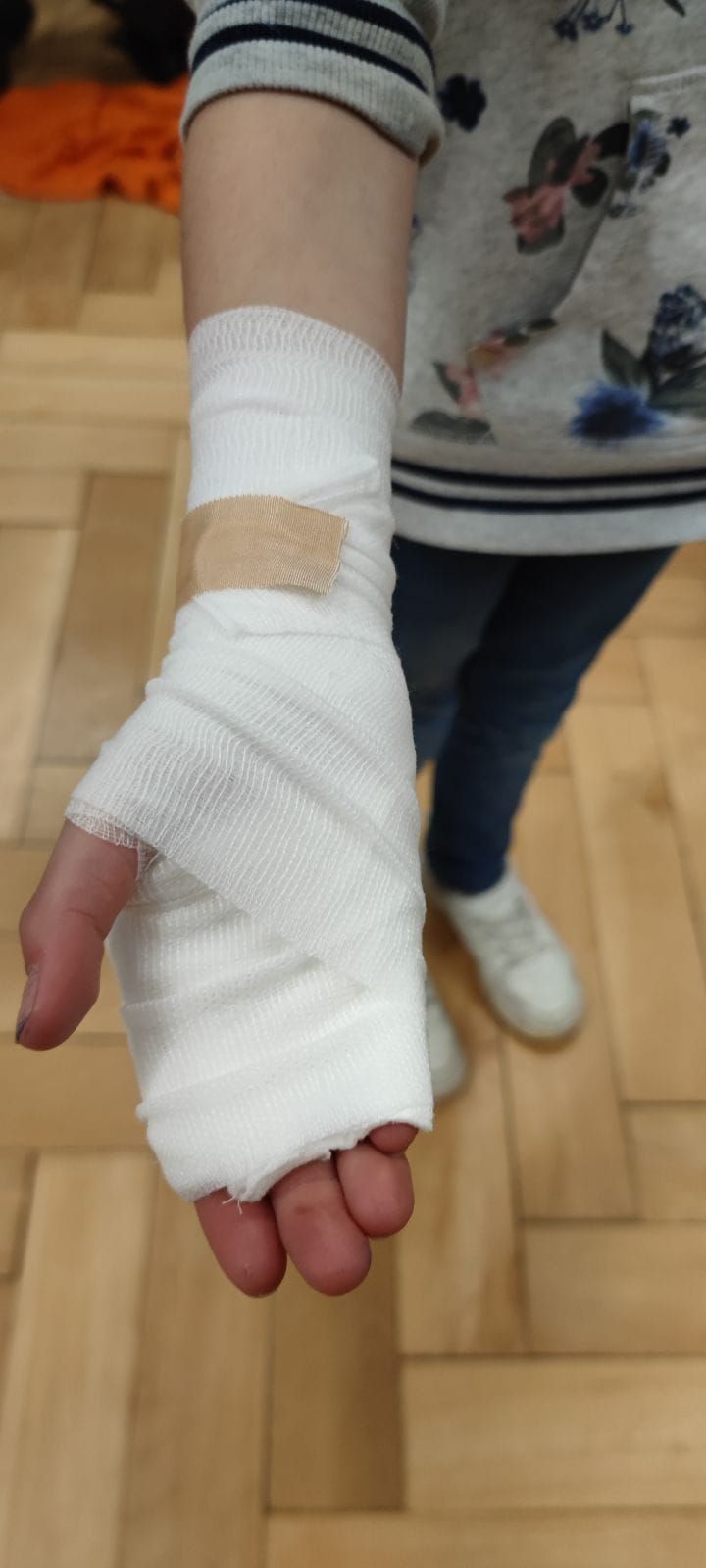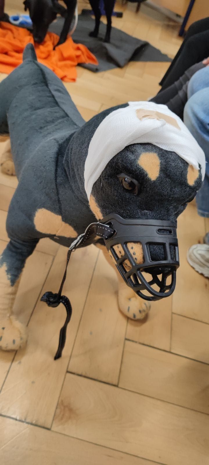 Zum Ansporn waren am zweiten Nachmittag auch zwei Erwachsene und sogar drei Hunde der DRK- Hundestaffel Tuttlingen dabei. Es wurden Verbände am Menschen mit Verbänden an Hunden verglichen - zwei rundum gelungene Wiederholungsnachmittage.