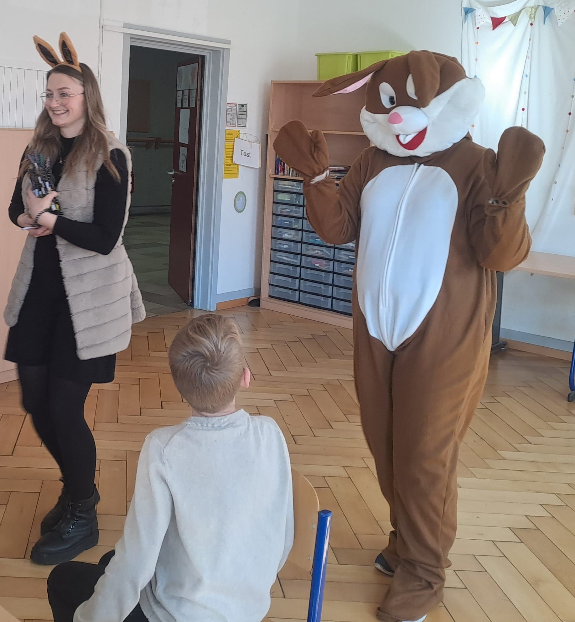 Der Osterhase persönlich besuchte die Friedensschule. Begleitet wurde er von zwei Mitgliedern unseres Fördervereins, die ihm helfend zur Seite standen. Gemeinsam machten sie sich auf den Weg durch die Klassen, um Schokolade und bunte Eier zu verteilen. Der Besuch des Hasen zauberte allen Anwesenden ein Lächeln ins Gesicht und stimmte auf die bevorstehende Osterzeit ein.
