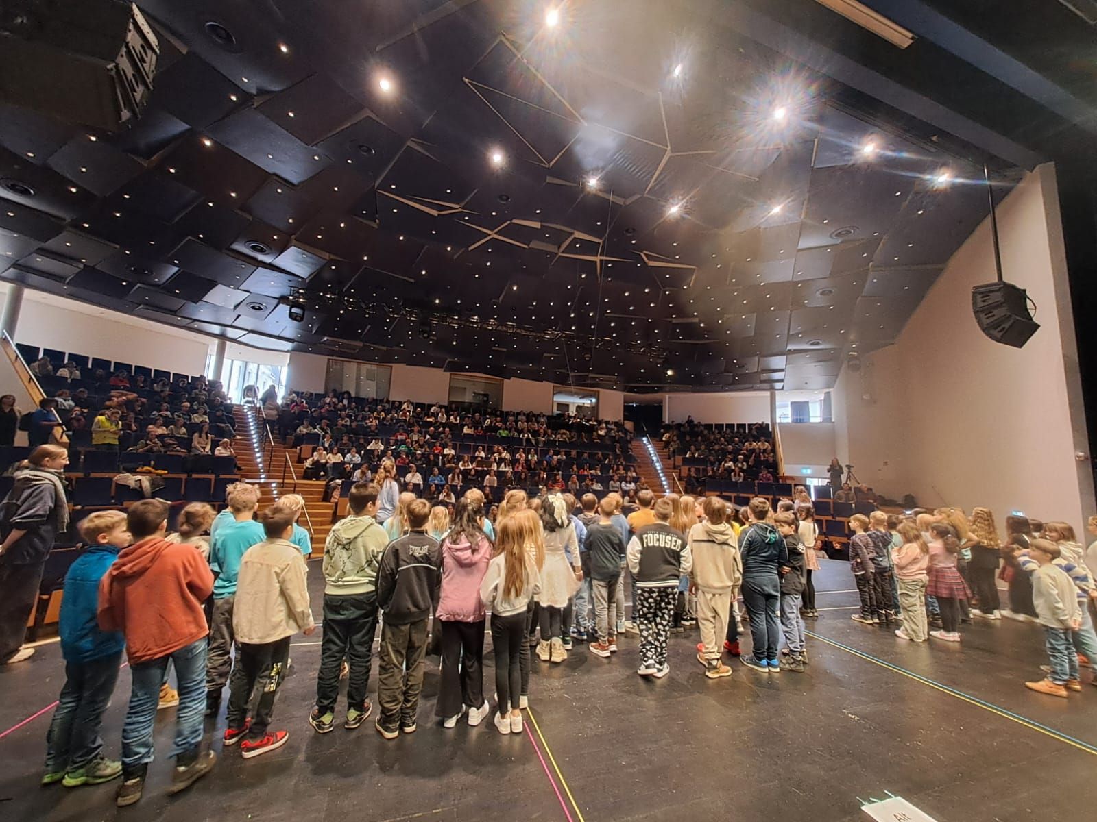 Auch unsere Friedensschule war vertreten: Die Klasse 4c nahm mit großer Begeisterung an dem musikalischen Projekt teil. In Zusammenarbeit mit zwei weiteren Grundschulklassen sangen die Schülerinnen und Schüler drei verschiedene Lieder gleichzeitig. Diese anspruchsvolle Darbietung erforderte viel Konzentration und Rhythmusgefühl – eine Herausforderung, die alle Kinder mit Bravour meisterten. Auch die anderen teilnehmenden Klassen präsentierten beeindruckende musikalische Beiträge, die das Publikum begeisterten.