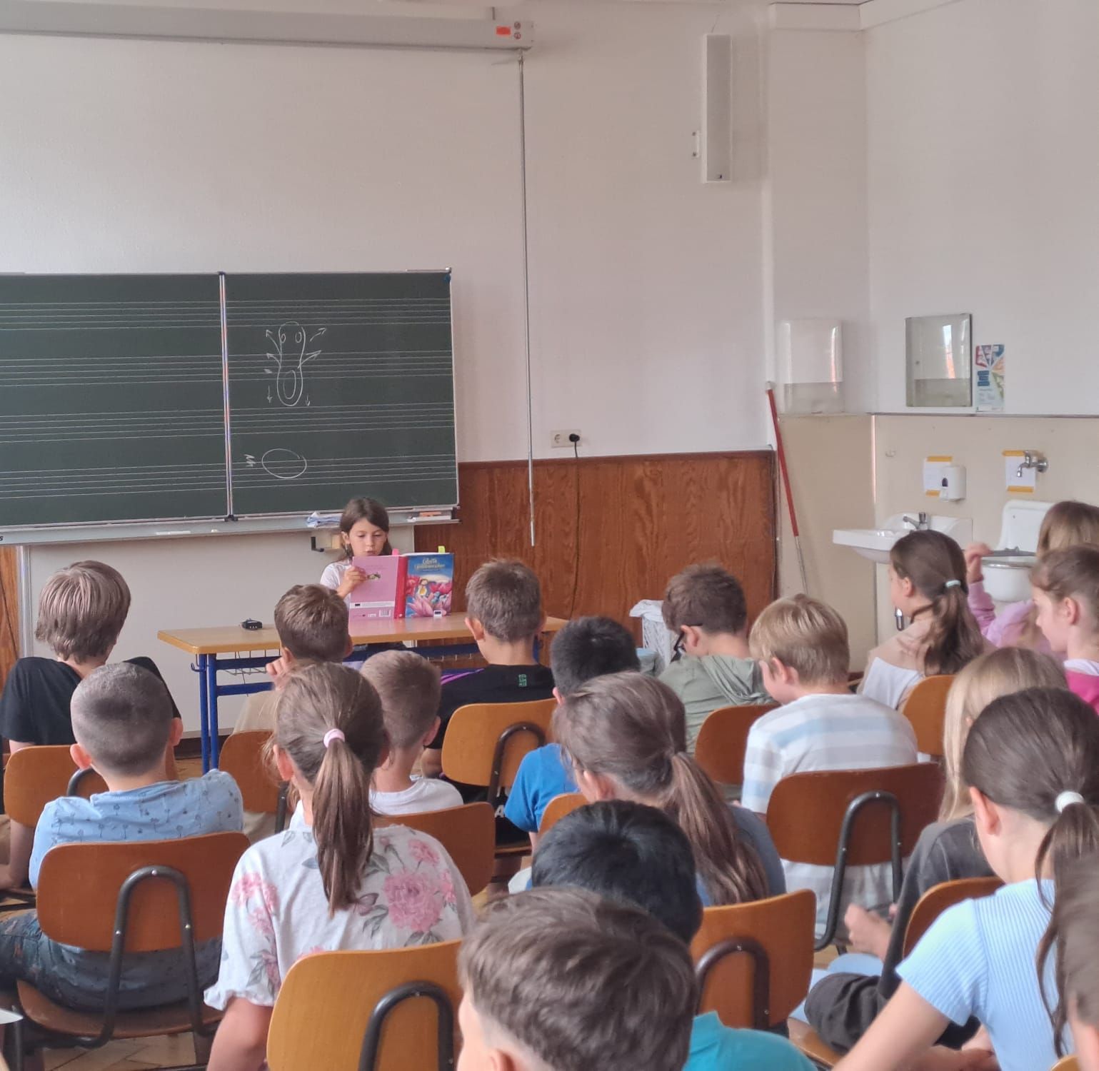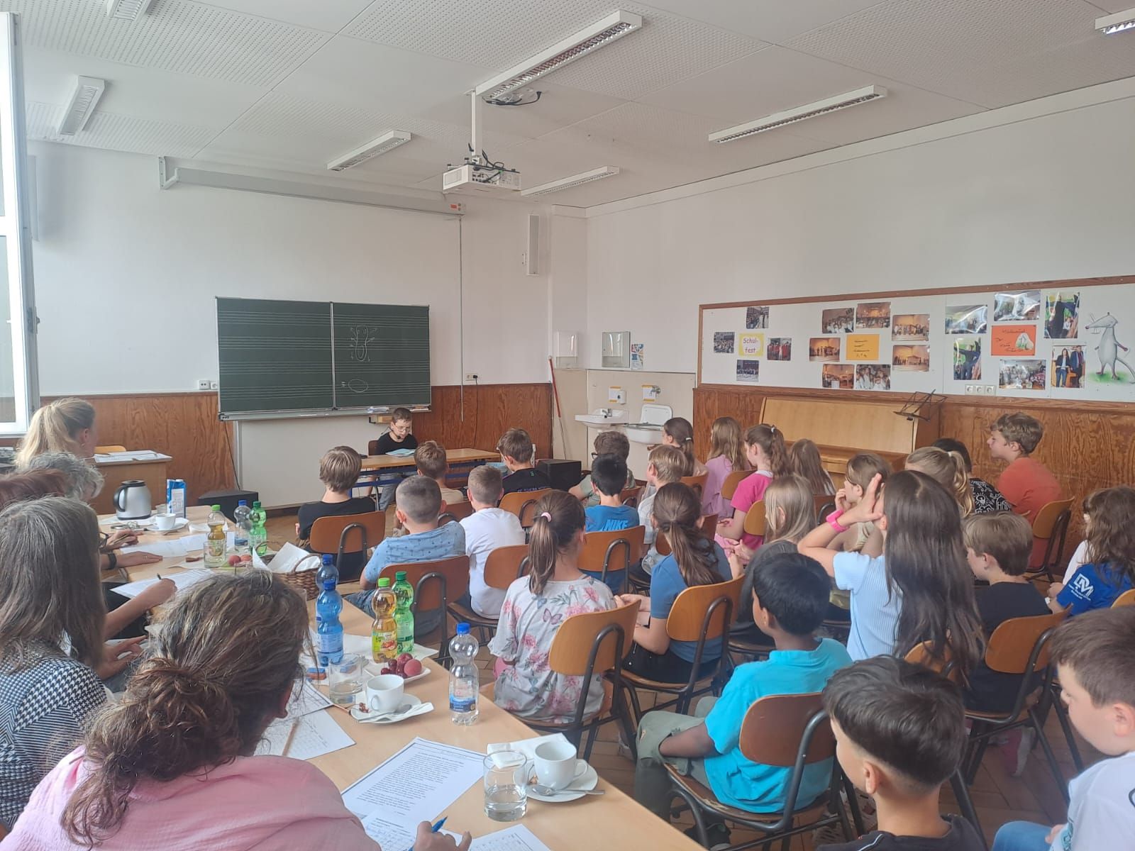 Von der ersten bis zur vierten Jahrgangsstufe traten pro Klasse ein Junge und ein Mädchen an, um mit ihren Beiträgen zu begeistern. Die Teilnehmenden stellten sich der Herausforderung sowohl bekannte als auch unbekannte Texte vorzulesen. Hierbei demonstrierten die Kinder ihre Lesefähigkeit und erweckten die Geschichten durch ihre Darbietungen zum Leben. Die Klassen bildeten das Publikum, hörten gespannt zu und unterstützen ihre Freunde und Freundinnen mit großem Applaus. Unsere fachkundige Jury hatte dann die schwierige Aufgabe, die besten Leistungen zu küren.